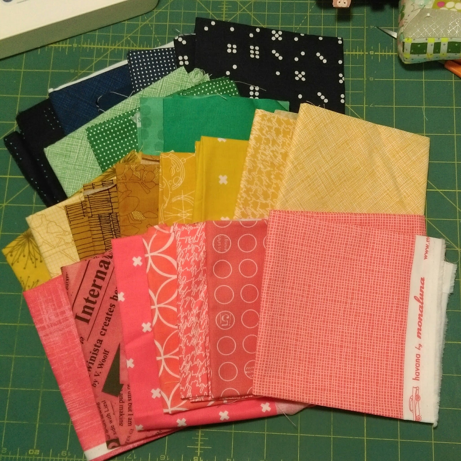I could really copy across my previous list for this quarter... but that would be dull. So I'll start with the hopefully achievable goals: First up I have the last few swap commitments to complete, and once these are finished, no more swaps for a while! I'm making a mini quilt for round four of the Schnitzel and Boo mini quilt swap: this is my fabric pull and this is the pattern I'm making.