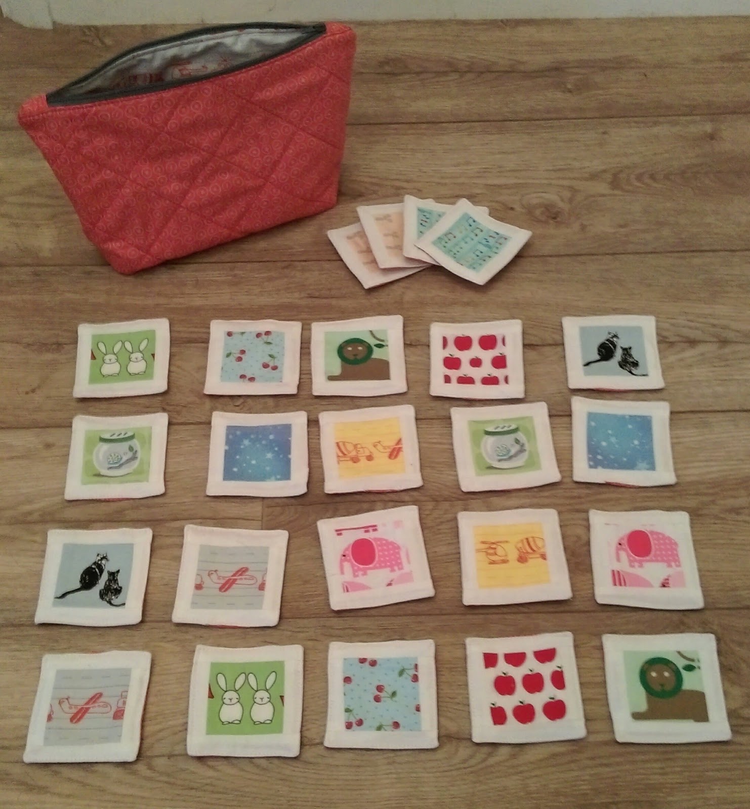 It's the time of year for snatched moments at the sewing machine, desperately sewing together last minute Christmas presents.... and today I finished one of those presents. At the start of December, with loads of time left before Christmas, I started making some pairs cards for Mia: I fussy cut from my fairly small stash of novelty fabrics: two of each print to make a total of 24 "cards". And very quickly I added the white borders.