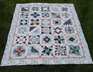 The subtle hint went along the lines of "big enough for our [large] bed" and "coastal colours". So I had free reign over pattern, so long as it was big. I came across a weekly block programme by Barbara Brackman called the Jane Austen Family Album quilt. I quite enjoy a Jane Austen read, though mostly, TV adaptation, and the background that came with each block was fascinating. I love the variety of a sampler quilt, and the blocks were 12" finished so created a large quilt quickly. Perfect!